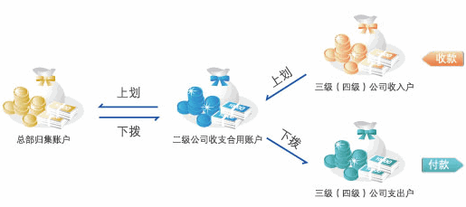 (3)集团成员三级或四级公司在当地建行开立两个单位银行结算账户,作为“收入账户”和“支出账户”使用。收入账户只收不付,实行零余额管理,每日清零,账户资金定时、自动、逐级划转至集团公司账户;支出账户只支不收,账户实行零余额管理(或存有固定余额),日间在核定的支用额度之内透支对外支付,透支资金由集团公司日终逐级下拨填平。