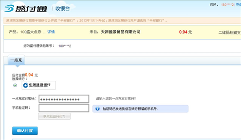 3.输入一点冲支付密码并且系统会向您的银行预留手机号码(非开通盛付通的手机号码)发送验证码,确认付款即可支付成功。