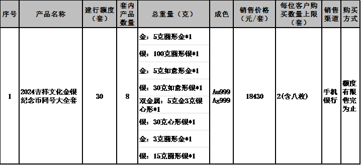 1.应有关要求,本次贵金属纪念币面向实名客户销售,2024吉祥文化金银纪念币同号大全套不限制客户星级,产品额度有限,售完即止。本产品对应的每位客户购买数量上限等请见本公告第一条中“具体产品信息”内容。