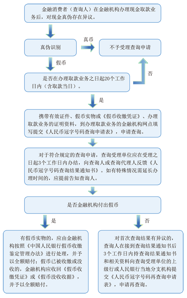 金融消费者(查询人)在金融机构办理现金取款业务后,对现金真伪存在异议,经金融机构进行真伪识别确认是假币的,查询人可向办理取款业务的金融机构网点(查询受理单位)提出冠字号码查询业务申请,以确认假币是否由该金融机构网点付出。