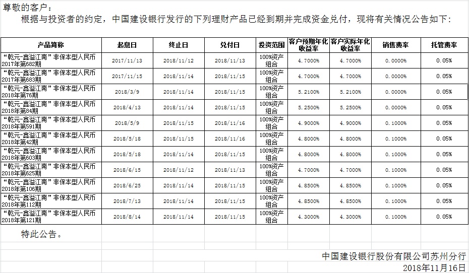 中国建设银行理财产品终止及清算公告