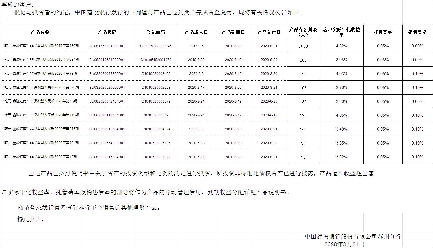 中国建设银行理财产品终止及清算公告